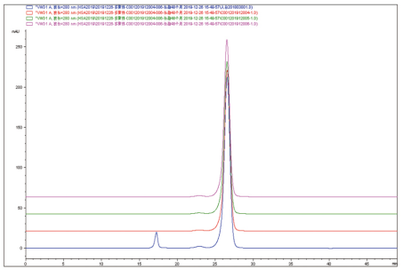 图2 pHSA与不同批次OsrHSA的HPLC结果(蓝线-pHSA,其他颜色-OsrHSA)