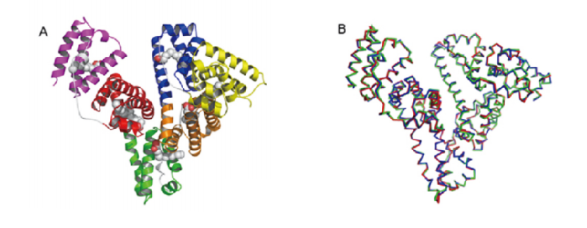 圆二色谱测定出OsrHSA 的分子结构主要为α螺旋,如图 1A所示,和pHSA一样,OsrHSA总体结构呈现出一个心形形状,由三个结构域组成。图1B中,OsrHSA和pHSA的两个分子的结构完全一致,完全重叠,说明 OsrHSA具有和pHSA相同的空间结构。