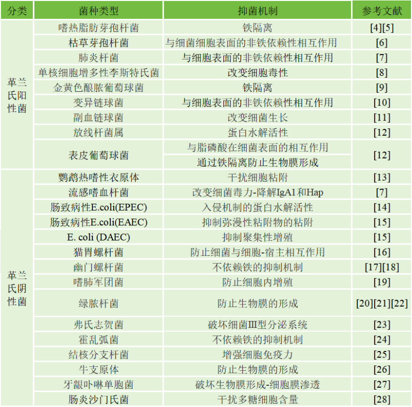 大量研究者研究了乳铁蛋白对于革兰氏阳性菌(G+)和革兰氏阴性菌(G-)在体内和体外的抑菌性能和机制,简单汇总如下: